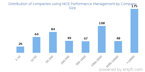 We have data on 613 companies that use NICE Performance Management. The companies using NICE Performance Management are most often found in United States and in the Information Technology and Services industry. NICE Performance Management is most often used by companies with >10000 employees and >1000M dollars in revenue. Our data for NICE Performance Management usage goes back as far as 8 years and 3 months.