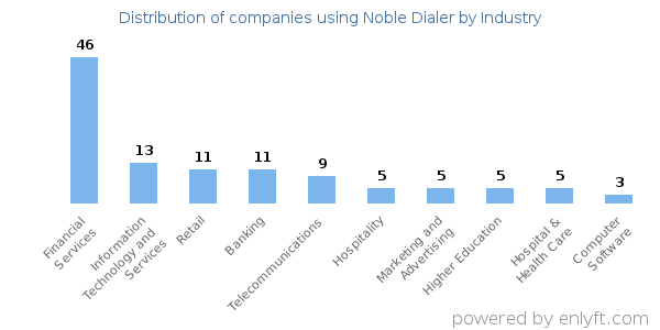 We have data on 153 companies that use Noble Dialer. The companies using Noble Dialer are most often found in United States and in the Financial Services industry. Noble Dialer is most often used by companies with >10000 employees and >1000M dollars in revenue. Our data for Noble Dialer usage goes back as far as 10 years and 2 months.