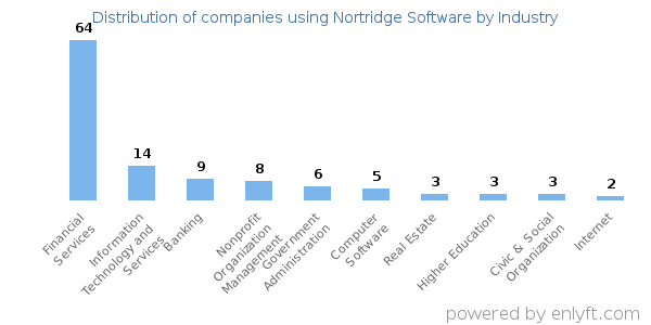 Looking at Nortridge Software customers by industry, we find that Financial Services (43%), Information Technology and Services (9%) and Banking (5%) are the largest segments.