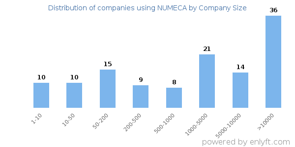 We have data on 127 companies that use NUMECA. The companies using NUMECA are most often found in United States and in the Higher Education industry. NUMECA is most often used by companies with >10000 employees and >1000M dollars in revenue. Our data for NUMECA usage goes back as far as 4 years and 4 months.