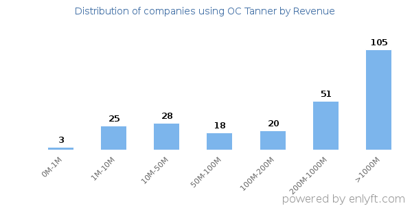 We have data on 263 companies that use OC Tanner. The companies using OC Tanner are most often found in United States and in the Hospital & Health Care industry. OC Tanner is most often used by companies with >10000 employees and >1000M dollars in revenue. Our data for OC Tanner usage goes back as far as 8 years and 5 months.