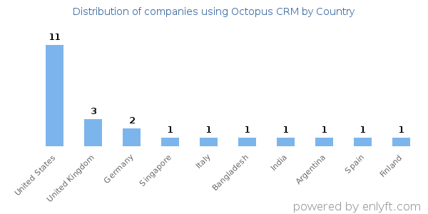 We have data on 26 companies that use Octopus CRM. The companies using Octopus CRM are most often found in United States and in the Marketing and Advertising industry. Octopus CRM is most often used by companies with 50-200 employees and 10M-50M dollars in revenue. Our data for Octopus CRM usage goes back as far as 3 years and 2 months.