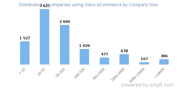 We have data on 10,897 companies that use Odoo eCommerce. The companies using Odoo eCommerce are most often found in United States and in the Information Technology and Services industry. Odoo eCommerce is most often used by companies with 10-50 employees and 1M-10M dollars in revenue. Our data for Odoo eCommerce usage goes back as far as 8 years and 5 months.