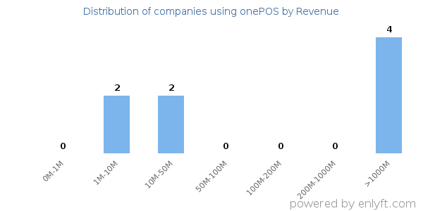 We have data on 8 companies that use onePOS. onePOS is most often used by companies with >10000 employees and >1000M dollars in revenue. Our data for onePOS usage goes back as far as 4 years and 6 months.