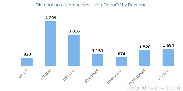 Of all the customers that are using OpenCV, a majority (53%) are small (<$50M), 25% are large (>$1000M) and 16% are medium-sized.
