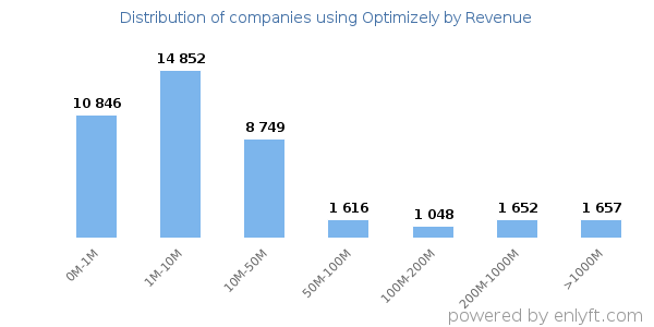 Of all the customers that are using Optimizely, a majority (75%) are small (<$50M), 14% are large (>$1000M) and 7% are medium-sized.