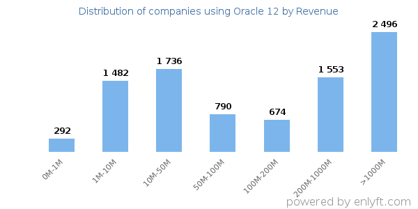 We have data on 9,443 companies that use Oracle 12. The companies using Oracle 12 are most often found in United States and in the Information Technology and Services industry. Oracle 12 is most often used by companies with 1000-5000 employees and >1000M dollars in revenue. Our data for Oracle 12 usage goes back as far as 9 years and 10 months.