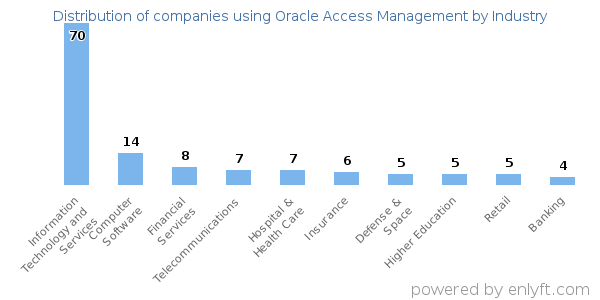 We have data on 182 companies that use Oracle Access Management. The companies using Oracle Access Management are most often found in United States and in the Information Technology and Services industry. Oracle Access Management is most often used by companies with >10000 employees and >1000M dollars in revenue. Our data for Oracle Access Management usage goes back as far as 3 years and 2 months.