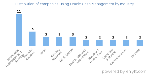 We have data on 52 companies that use Oracle Cash Management. The companies using Oracle Cash Management are most often found in United States and in the Information Technology and Services industry. Oracle Cash Management is most often used by companies with >10000 employees and >1000M dollars in revenue. Our data for Oracle Cash Management usage goes back as far as 1 years and 7 months.