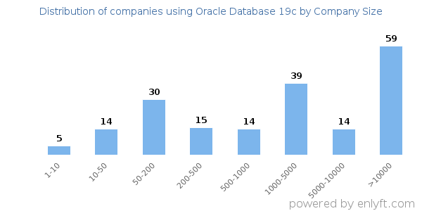 Of all the customers that are using Oracle Database 19c, a majority (57%) are large (>1000 employees), 9% are small (<50 employees) and 29% are medium-sized.