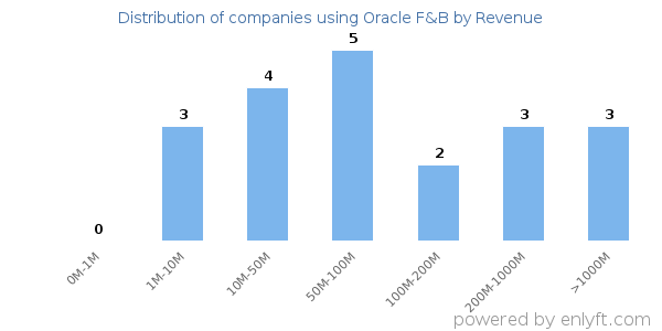 We have data on 20 companies that use Oracle F&B. The companies using Oracle F&B are most often found in United States and in the Hospitality industry. Oracle F&B is most often used by companies with 1000-5000 employees and 50M-100M dollars in revenue. Our data for Oracle F&B usage goes back as far as 5 years and 3 months.
