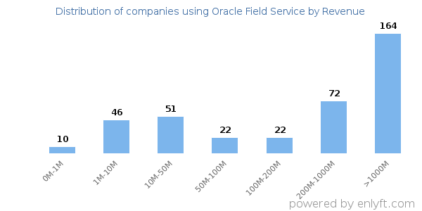 Of all the customers that are using Oracle Field Service, a majority (59%) are large (>$1000M), 25% are small (<$50M) and 12% are medium-sized.