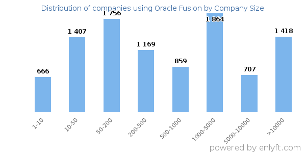 Of all the customers that are using Oracle Fusion, 21% are small (<50 employees), 39% are medium-sized and 40% are large (>1000 employees).
