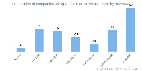 Of all the customers that are using Oracle Fusion Procurement, 31% are small (<$50M), 17% are medium-sized and 46% are large (>$1000M).