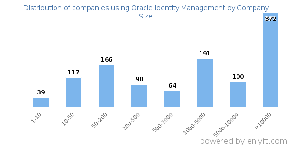 Of all the customers that are using Oracle Identity Management, a majority (57%) are large (>$1000M), 28% are small (<$50M) and 12% are medium-sized.