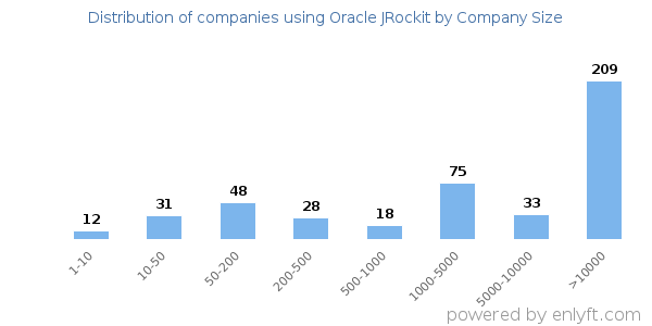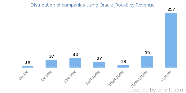 We have data on 460 companies that use Oracle JRockit. The companies using Oracle JRockit are most often found in United States and in the Information Technology and Services industry. Oracle JRockit is most often used by companies with >10000 employees and >1000M dollars in revenue. Our data for Oracle JRockit usage goes back as far as 9 years and 10 months.