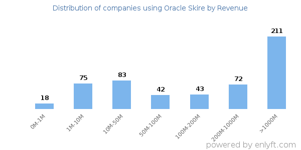 We have data on 567 companies that use Oracle Skire. The companies using Oracle Skire are most often found in United States and in the Information Technology and Services industry. Oracle Skire is most often used by companies with >10000 employees and >1000M dollars in revenue. Our data for Oracle Skire usage goes back as far as 9 years and 7 months.