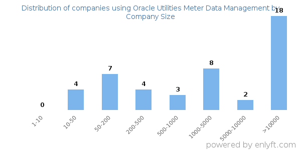 We have data on 48 companies that use Oracle Utilities Meter Data Management. The companies using Oracle Utilities Meter Data Management are most often found in United States and in the Information Technology and Services industry. Oracle Utilities Meter Data Management is most often used by companies with >10000 employees and >1000M dollars in revenue. Our data for Oracle Utilities Meter Data Management usage goes back as far as 5 years and 2 months.