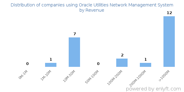We have data on 25 companies that use Oracle Utilities Network Management System. The companies using Oracle Utilities Network Management System are most often found in United States and in the Utilities industry. Oracle Utilities Network Management System is most often used by companies with >10000 employees and >1000M dollars in revenue. Our data for Oracle Utilities Network Management System usage goes back as far as 5 years and 3 months.