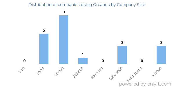 Of all the customers that are using Orcanos, 44% are small (<$50M), 0% are medium-sized and 20% are large (>$1000M).