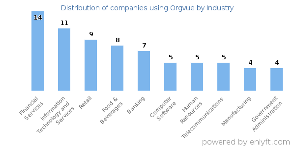 We have data on 122 companies that use Orgvue. The companies using Orgvue are most often found in United States and in the Financial Services industry. Orgvue is most often used by companies with >10000 employees and >1000M dollars in revenue. Our data for Orgvue usage goes back as far as 3 years.