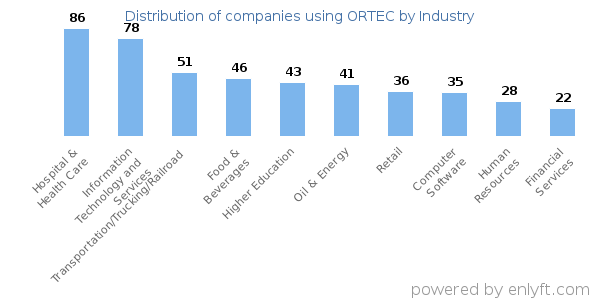 Looking at ORTEC customers by industry, we find that Hospital & Health Care (9%), Information Technology and Services (8%) and Transportation/Trucking/Railroad (5%) are the largest segments.