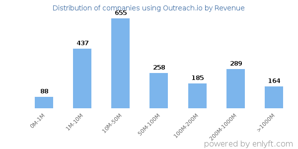 Of all the customers that are using Outreach.io, a majority (52%) are small (<$50M), 22% are large (>$1000M) and 21% are medium-sized.