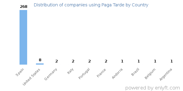 We have data on 311 companies that use Paga Tarde. The companies using Paga Tarde are most often found in Spain and in the Retail industry. Paga Tarde is most often used by companies with 1-10 employees and 1M-10M dollars in revenue. Our data for Paga Tarde usage goes back as far as 5 years and 2 months.