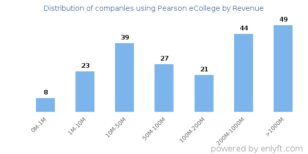 We have data on 218 companies that use Pearson eCollege. The companies using Pearson eCollege are most often found in United States and in the Higher Education industry. Pearson eCollege is most often used by companies with 1000-5000 employees and >1000M dollars in revenue. Our data for Pearson eCollege usage goes back as far as 8 years and 5 months.