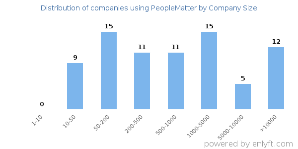 Of all the customers that are using PeopleMatter, 10% are small (<50 employees), 44% are medium-sized and 37% are large (>1000 employees).