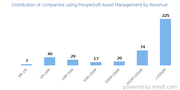 We have data on 423 companies that use PeopleSoft Asset Management. The companies using PeopleSoft Asset Management are most often found in United States and in the Information Technology and Services industry. PeopleSoft Asset Management is most often used by companies with >10000 employees and >1000M dollars in revenue. Our data for PeopleSoft Asset Management usage goes back as far as 10 years and 2 months.
