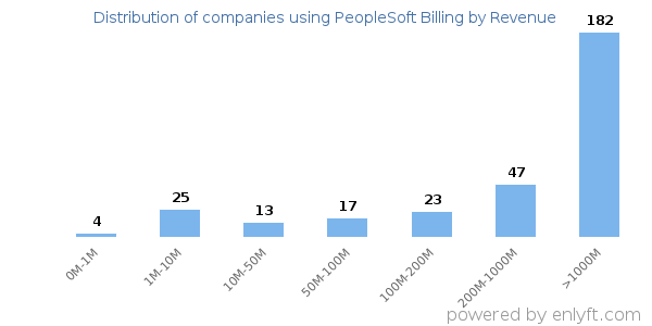 We have data on 319 companies that use PeopleSoft Billing. The companies using PeopleSoft Billing are most often found in United States and in the Information Technology and Services industry. PeopleSoft Billing is most often used by companies with >10000 employees and >1000M dollars in revenue. Our data for PeopleSoft Billing usage goes back as far as 10 years and 1 months.
