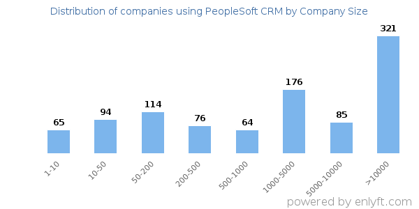 We have data on 1,003 companies that use PeopleSoft CRM. The companies using PeopleSoft CRM are most often found in United States and in the Information Technology and Services industry. PeopleSoft CRM is most often used by companies with >10000 employees and >1000M dollars in revenue. Our data for PeopleSoft CRM usage goes back as far as 10 years and 3 months.