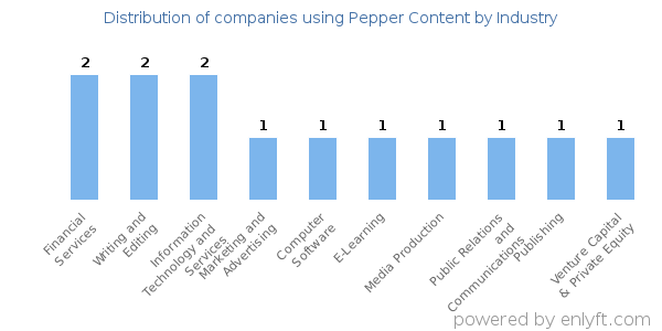We have data on 14 companies that use Pepper Content. The companies using Pepper Content are most often found in United States and in the Financial Services industry. Pepper Content is most often used by companies with 1000-5000 employees and 10M-50M dollars in revenue. Our data for Pepper Content usage goes back as far as 2 years and 2 months.