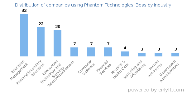 Looking at Phantom Technologies iBoss customers by industry, we find that Education Management (20%), Primary/Secondary Education (14%) and Information Technology and Services (13%) are the largest segments.