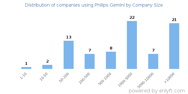 We have data on 81 companies that use Philips Gemini. The companies using Philips Gemini are most often found in United States and in the Hospital & Health Care industry. Philips Gemini is most often used by companies with 1000-5000 employees and >1000M dollars in revenue. Our data for Philips Gemini usage goes back as far as 8 years and 5 months.