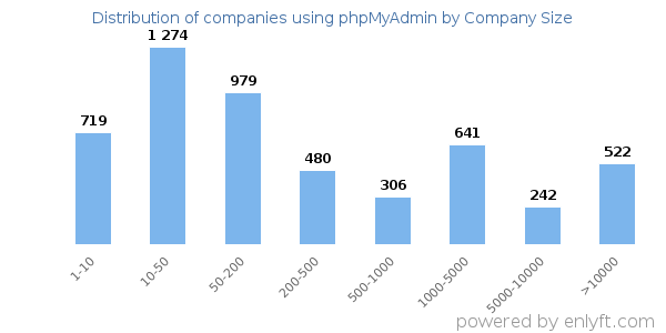 We have data on 5,317 companies that use phpMyAdmin. The companies using phpMyAdmin are most often found in United States and in the Information Technology and Services industry. phpMyAdmin is most often used by companies with 10-50 employees and 1M-10M dollars in revenue. Our data for phpMyAdmin usage goes back as far as 6 years.
