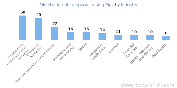 Looking at Pipz customers by industry, we find that Information Technology and Services (12%), Computer Software (11%) and Transportation/Trucking/Railroad (7%) are the largest segments.