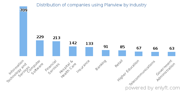 Looking at Planview customers by industry, we find that Information Technology and Services (21%), Computer Software (7%) and Financial Services (6%) are the largest segments.