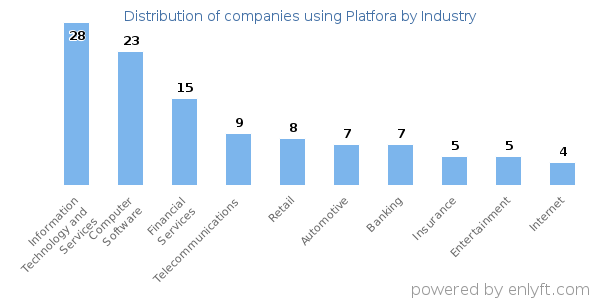 We have data on 188 companies that use Platfora. The companies using Platfora are most often found in United States and in the Information Technology and Services industry. Platfora is most often used by companies with >10000 employees and >1000M dollars in revenue. Our data for Platfora usage goes back as far as 8 years and 7 months.