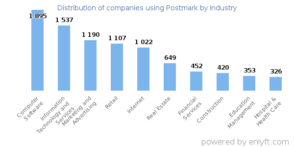 We have data on 26,268 companies that use Postmark. The companies using Postmark are most often found in United States and in the Computer Software industry. Postmark is most often used by companies with 1-10 employees and 1M-10M dollars in revenue. Our data for Postmark usage goes back as far as 8 years and 11 months.