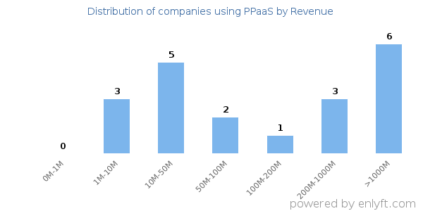 We have data on 21 companies that use PPaaS. The companies using PPaaS are most often found in United States and in the Information Technology and Services industry. PPaaS is most often used by companies with >10000 employees and >1000M dollars in revenue. Our data for PPaaS usage goes back as far as 3 years and 5 months.