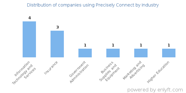 We have data on 13 companies that use Precisely Connect. The companies using Precisely Connect are most often found in United States and in the Information Technology and Services industry. Precisely Connect is most often used by companies with 50-200 employees and 10M-50M dollars in revenue. Our data for Precisely Connect usage goes back as far as 2 years and 7 months.