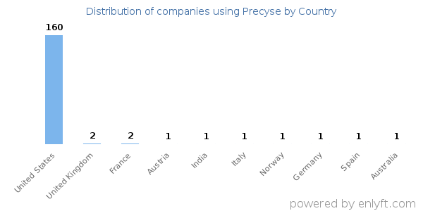We have data on 174 companies that use Precyse. The companies using Precyse are most often found in United States and in the Hospital & Health Care industry. Precyse is most often used by companies with 1000-5000 employees and >1000M dollars in revenue. Our data for Precyse usage goes back as far as 8 years and 5 months.