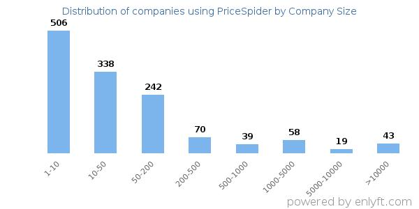 We have data on 1,641 companies that use PriceSpider. The companies using PriceSpider are most often found in United States and in the Retail industry. PriceSpider is most often used by companies with 1-10 employees and 1M-10M dollars in revenue. Our data for PriceSpider usage goes back as far as 5 years and 2 months.