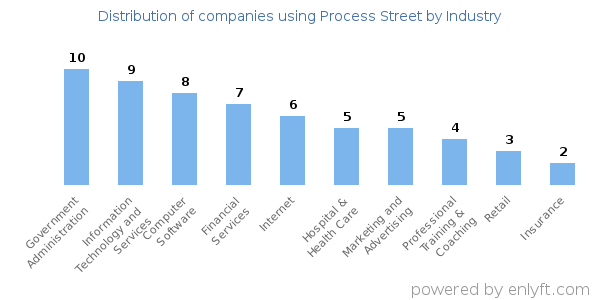 We have data on 89 companies that use Process Street. The companies using Process Street are most often found in United States and in the Government Administration industry. Process Street is most often used by companies with 10-50 employees and 1M-10M dollars in revenue. Our data for Process Street usage goes back as far as 6 years.