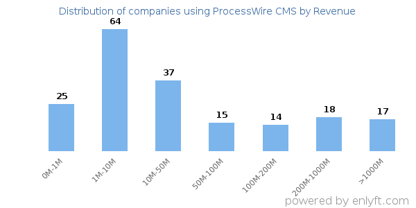 Of all the customers that are using ProcessWire CMS, a majority (64%) are small (<$50M), 18% are large (>$1000M) and 8% are medium-sized.