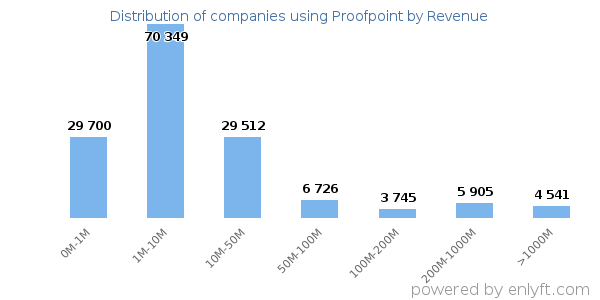 Of all the customers that are using Proofpoint, a majority (72%) are small (<$50M), 14% are large (>$1000M) and 8% are medium-sized.