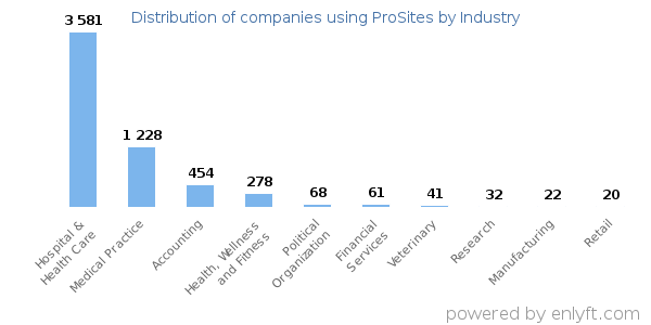 Looking at ProSites customers by industry, we find that Hospital & Health Care (50%), Medical Practice (17%) and Accounting (7%) are the largest segments.