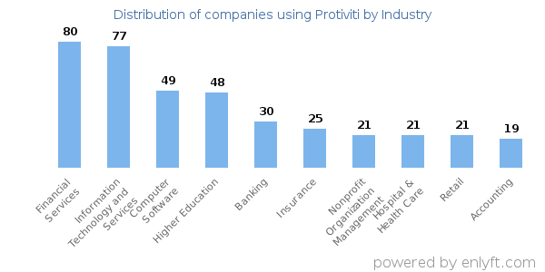 We have data on 819 companies that use Protiviti. The companies using Protiviti are most often found in United States and in the Financial Services industry. Protiviti is most often used by companies with >10000 employees and >1000M dollars in revenue. Our data for Protiviti usage goes back as far as 10 years and 1 months.
